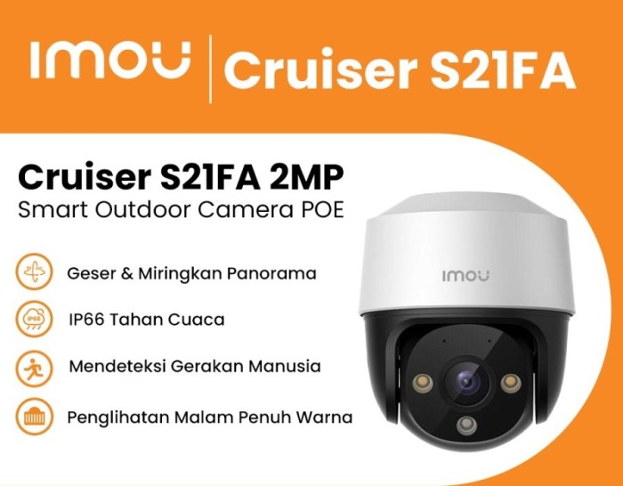 Nah yang terakhir ada dari Imou Cruiser IPC-S21FA PoE 2MP Full Color Night Vision. Ini adalah kamera keamanan PTZ (Pan-Tilt-Zoom) yang menawarkan pengawasan penuh untuk seisi ruangan. Kamera ini menarik untuk dilihat lebih dekat karena beberapa fitur utamanya.