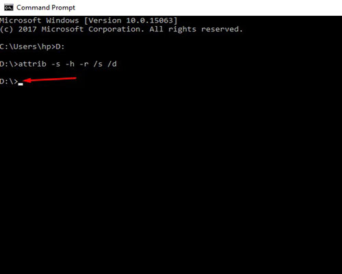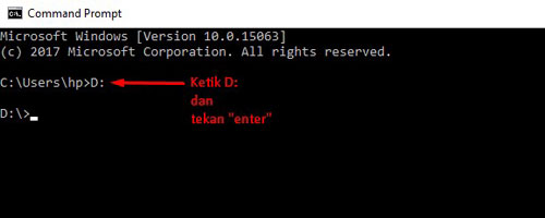 3. Pada bagian tampilan “CMD”, perlu dipindahkan dahulu ke drive flashdisk Anda, saya contohkan dibawah flashdisk yang terkena virusnya adalah di Drive D, maka saya pindahkan dahulu ke Drive D (seperti pada gambar) - Ketik “D:” (nama_drive diakhiri tanda titik 2) dan tekan “Enter” - Ketik “attrib –s –h –r /s /d “ (tanpa petik 2) – tekan “Enter”