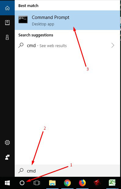 2. Buka “Command Prompt / CMD” dengan cara: (admin contoh pakai windows 10) - Klik kiri pada logo “search” (1) - Pada bagian type here, ketik “CMD” (2) - Muncul part CMD diatas, klik kiri pada “Command Prompt / CMD” (3)