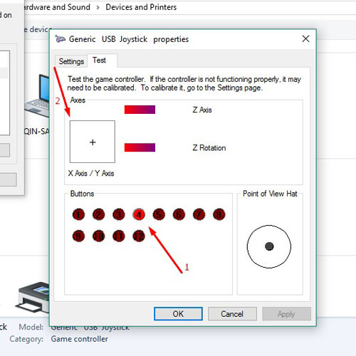 5. Masuk ke menu Generic USB Joystick properties, maka akan muncul tampilan seperti dibawah, tekan semua tombol joystick yang tersedia, setiap tombol akan muncul merah (1), termasuk start dan select, tapi untuk bagian kiri kanan akan muncul pergerakan cursor (2).