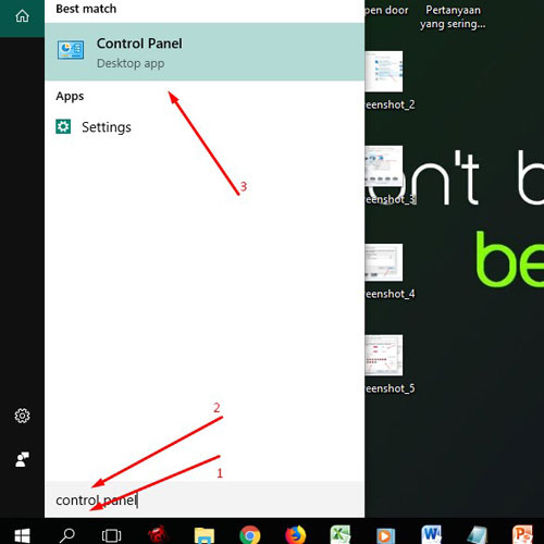 1. Masuk ke Windows 10, klik tombol search (1), ketik "control panel" (2), klik control panel (3)