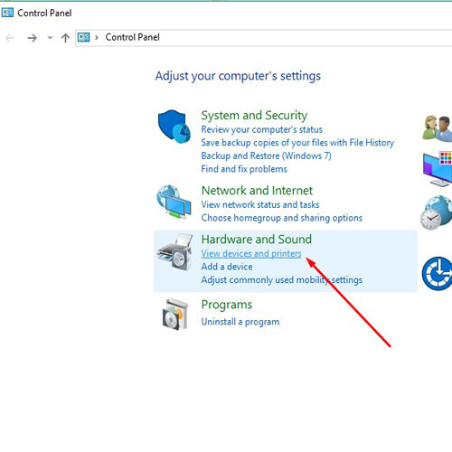 2. Pada bagian Hardware and Sound, klik "View devices and printers"