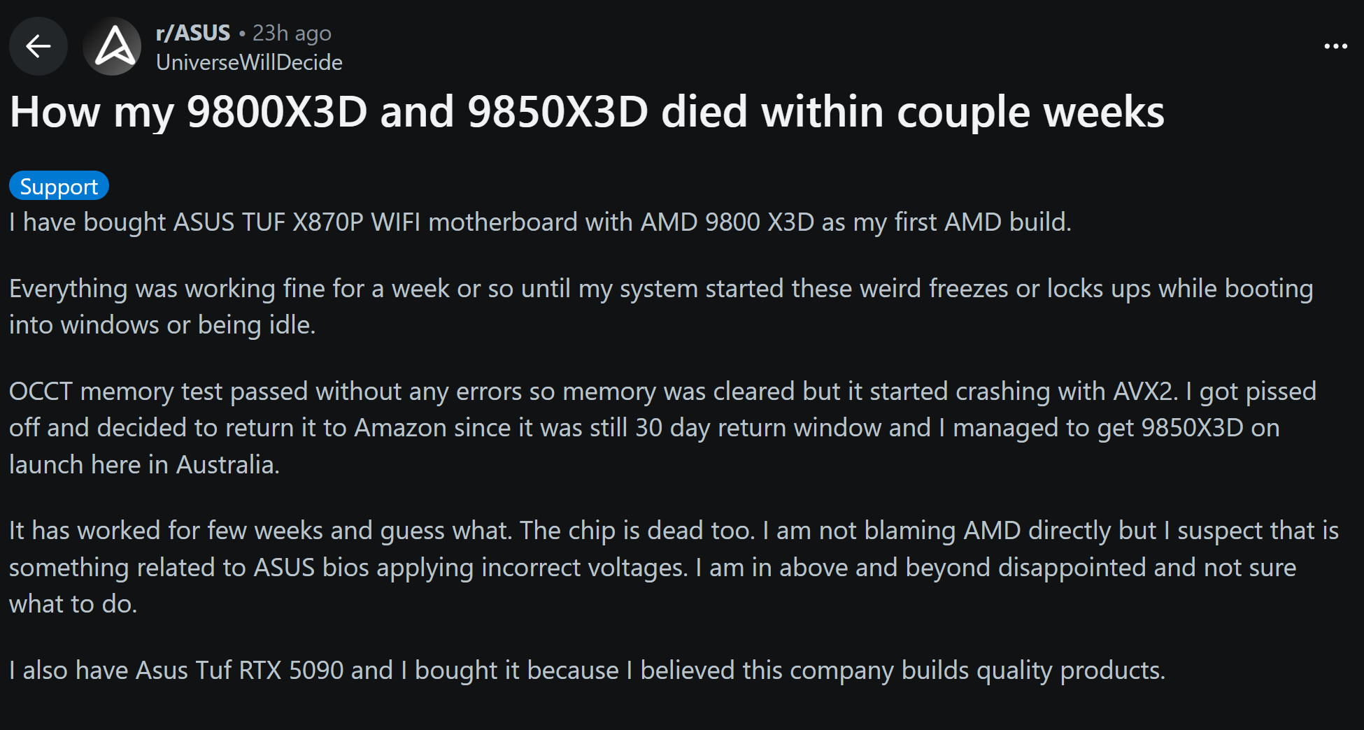 Kasus ini muncul tidak lama setelah beberapa laporan lain mengenai kegagalan CPU seri Ryzen 9000 pada motherboard seri 800. Produsen motherboard ASUS sebelumnya telah menyatakan bahwa mereka sedang melakukan investigasi internal terhadap laporan CPU Ryzen 9800X3D yang mati pada motherboard berbasis chipset X870 dan B850.