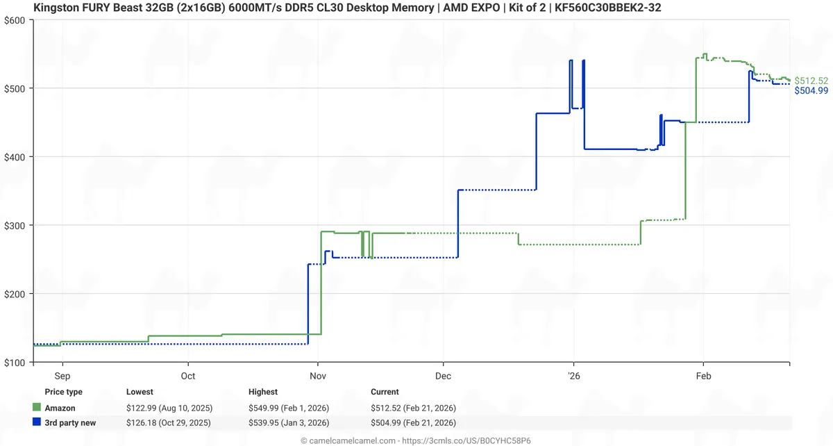 Dalam beberapa bulan terakhir, harga kit memori 32GB DDR5 dari berbagai brand seperti Corsair, Kingston, G.Skill, Crucial, dan Patriot sempat melonjak tajam. Pada awal Februari 2026, beberapa kit bahkan mencapai kisaran €430 hingga €470 di pasar Eropa.