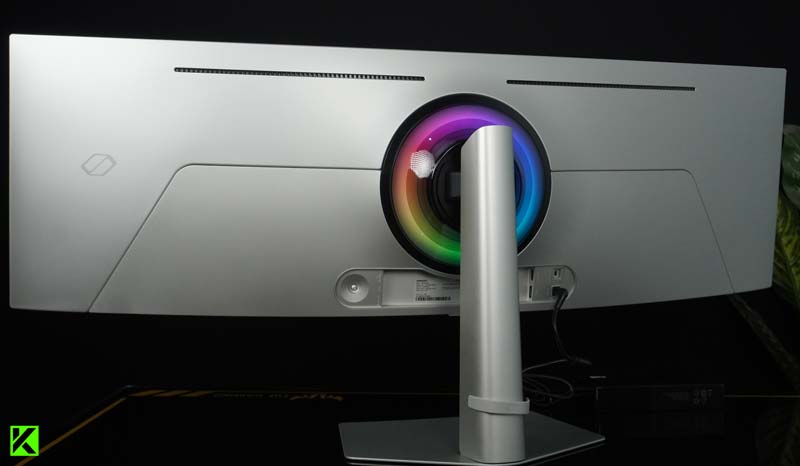 Bagian belakang monitor ini memiliki mekanisme sederhana untuk cable management dengan rubber strap, serta area untuk memasang VESA mounting 100 x 100 mm jika ingin dipasang di dinding.