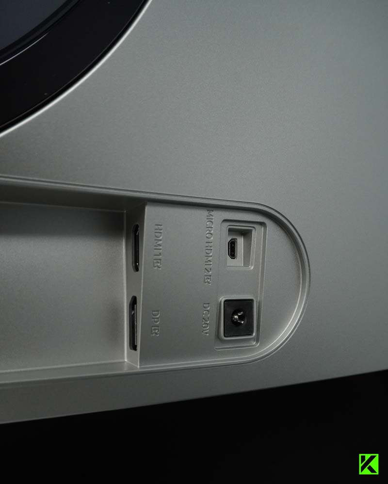 Bagian bawah monitor ini menyediakan konektor IO, termasuk konektor DC In, Micro HDMI, HDMI 2.1, DisplayPort 1.4, dan tiga port USB Type C di bagian kiri untuk transfer data.