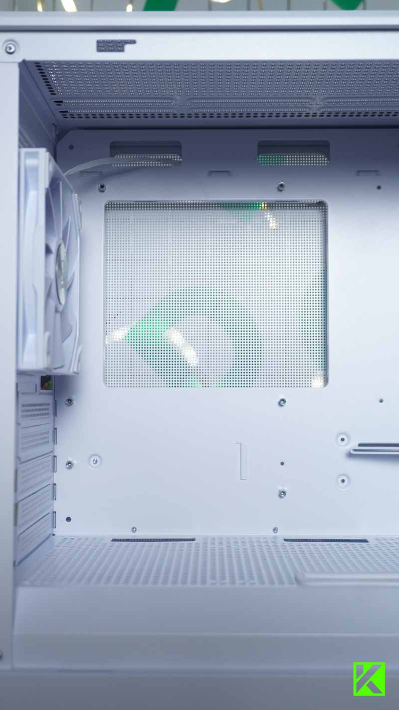 Di bagian depan, kamu bisa pasang dua kipas 120mm atau dua kipas 140mm. Di atas, ada slot buat tiga kipas 120mm, dan bahkan di bawah pun disediakan tempat buat tiga kipas 120mm. Belakangnya? Masih ada satu kipas 120mm. Total kamu bisa pasang sembilan kipas!