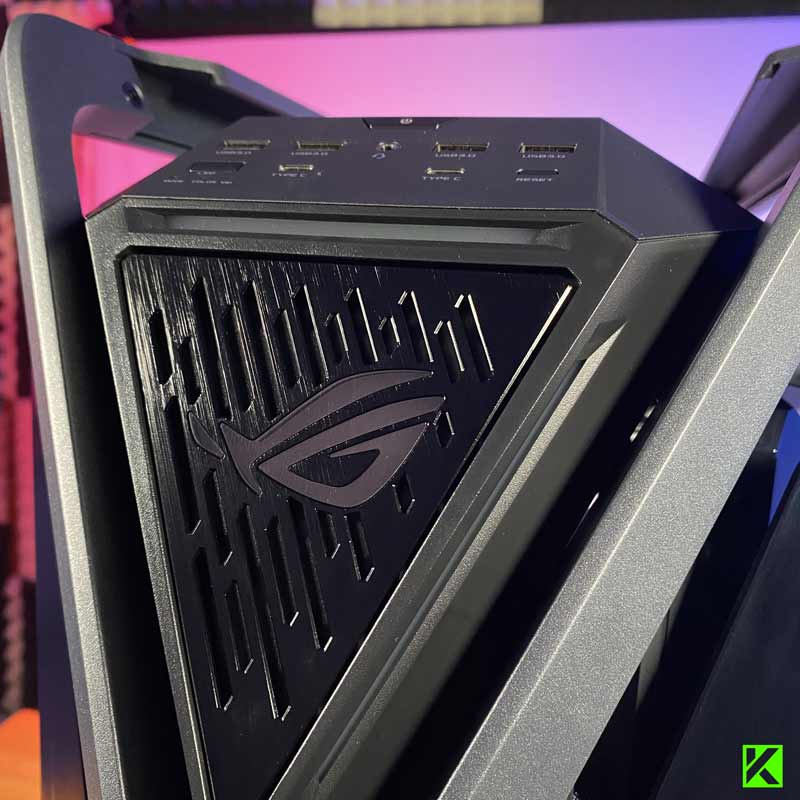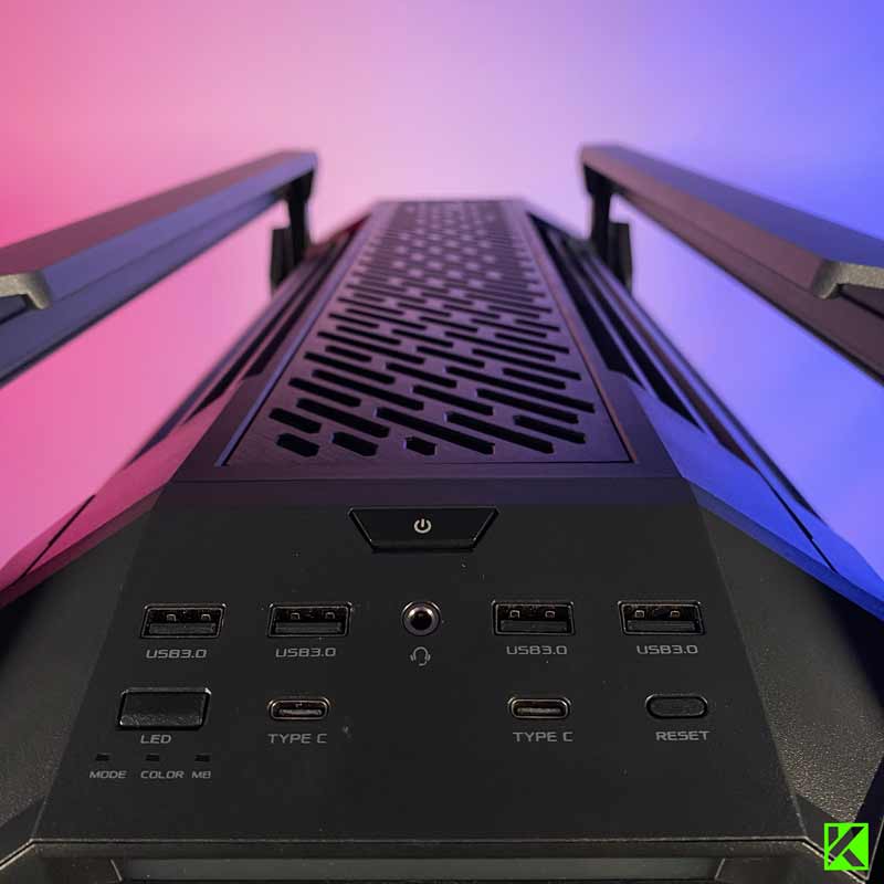 Nah beralih ke slot pengisian daya. Casing ini terdapat DUAL TYPE-C Ultra-Fast Charging lho. Bagian depan setiap sasis ROG ini menawarkan sejumlah konektor, dan ROG Hyperion menambah tradisi dengan dua konektor USB Type-C® yang dapat menawarkan transfer data hingga 20 Gbps dan pengisian cepat hingga 60 watt dengan yang kompatibel.