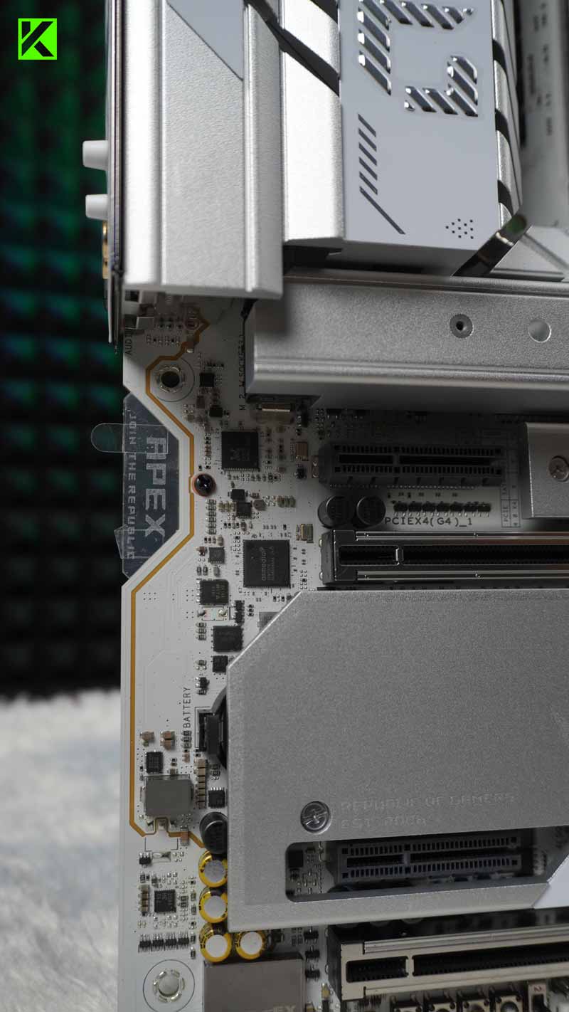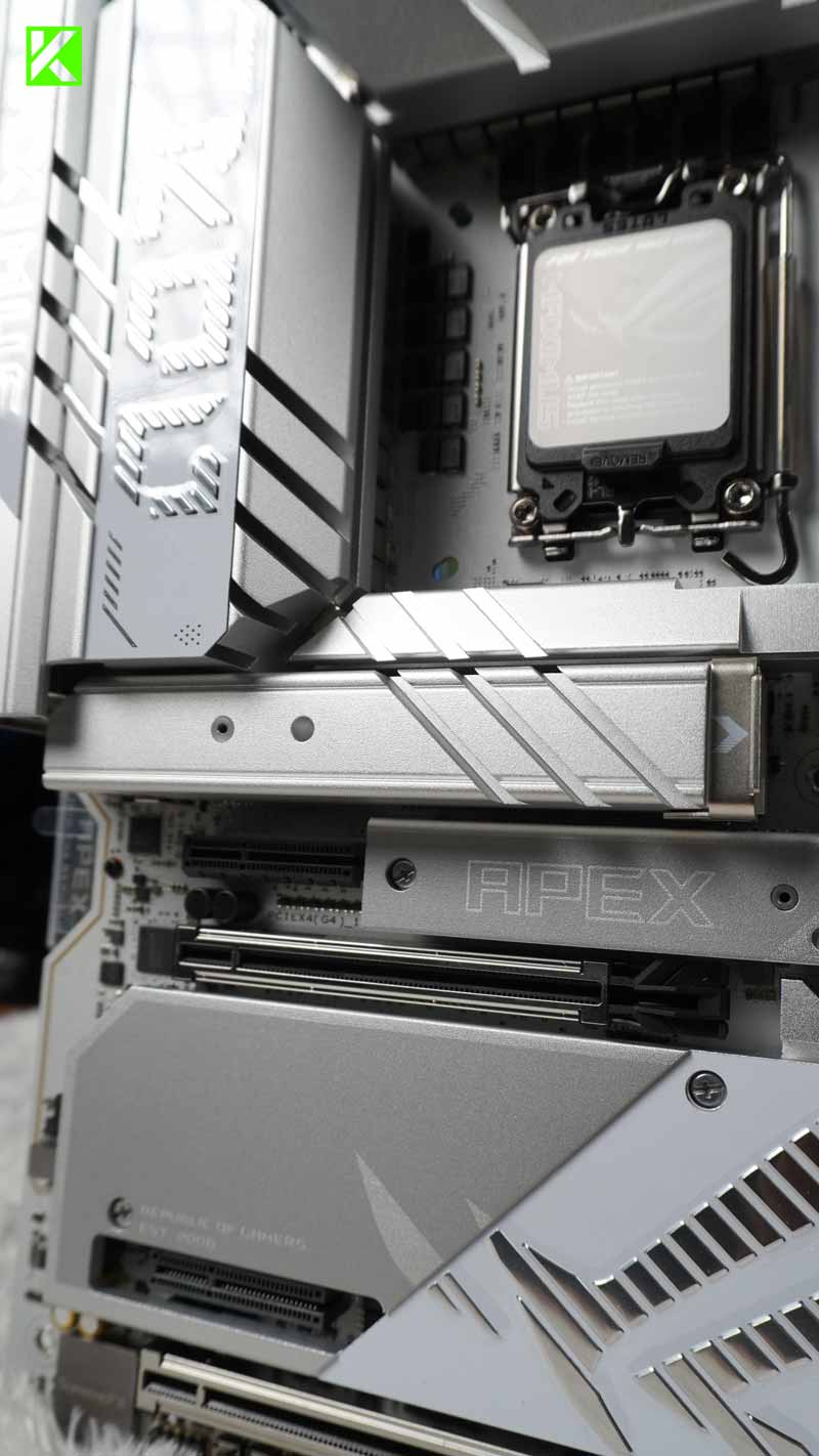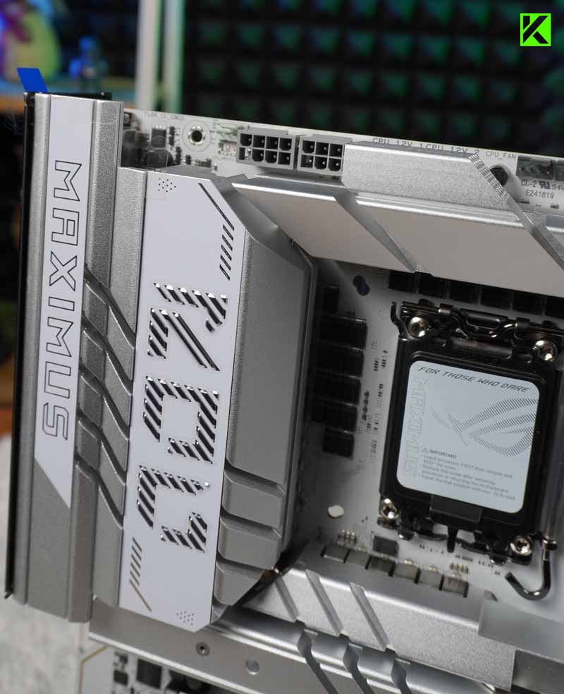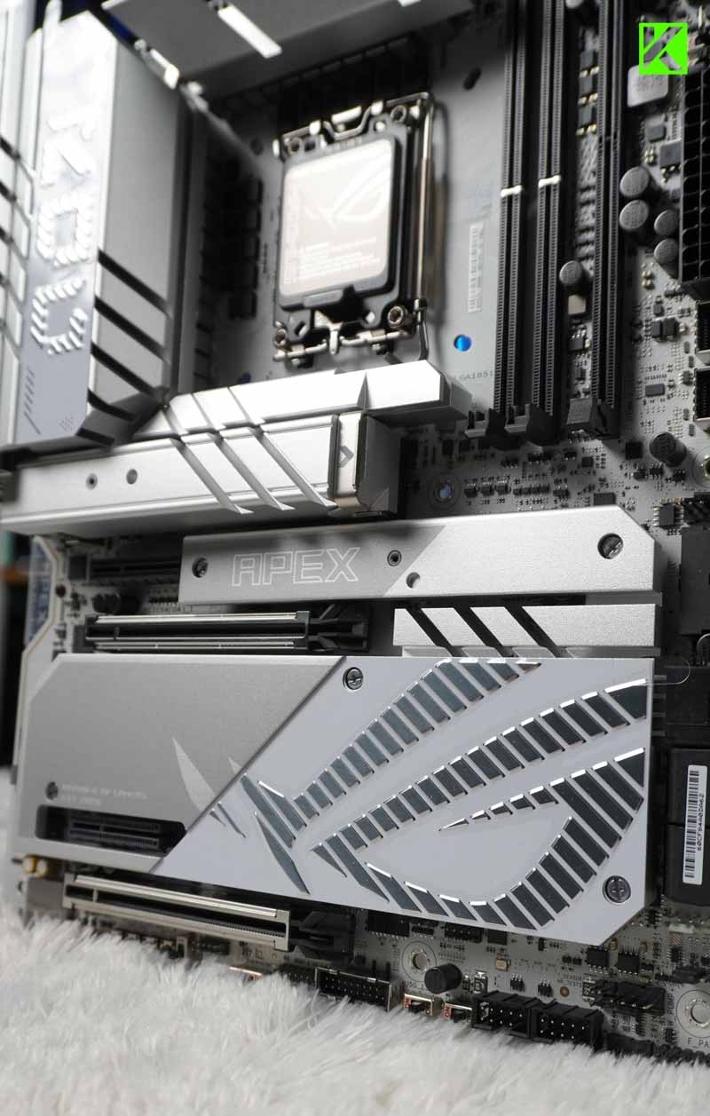 Tidak hanya dari segi performa, ASUS ROG MAXIMUS Z890 APEX juga menonjol dari sisi desain. Tampilan yang futuristik dengan aksen khas ROG memberikan kesan tangguh dan premium.
