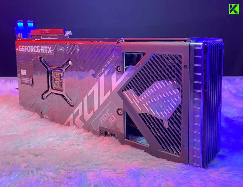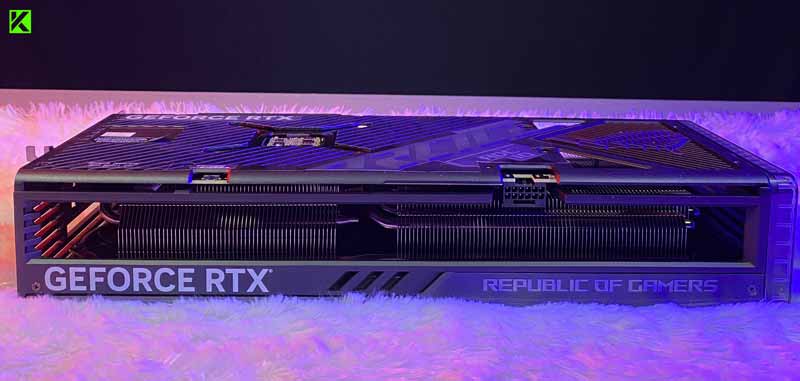Power connector pada kartu grafis ini menggunakan model 1x16-pin, tentu saja ASUS sudah menyediakan satu buah kabel adapter 1-to-3 di dalam paket penjualannya. Tidak hanya itu, ASUS juga sudah memberikan holder kartu grafis untuk penggunanya sehingga bisa memasang dalam posisi vertikal di dalam casing.