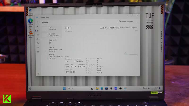 ASUS TUF A14 (2024) dibekali prosesor AMD Ryzen™ 7 8845HS, yang punya kecepatan dasar 3.8GHz dan bisa ditingkatkan hingga 5.1GHz. Prosesor ini punya 8 inti dan 16 thread, jadi cocok banget buat multitasking. Entah kamu lagi edit video, main game AAA, atau menjalankan beberapa aplikasi berat sekaligus, laptop ini nggak akan ngelag.
