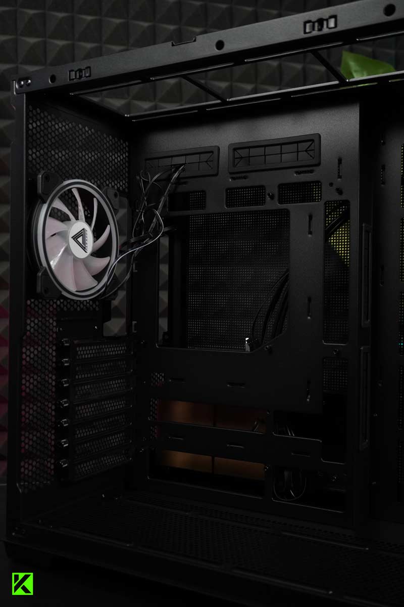Casing ini dilengkapi dengan 1x kipas ARGB 120mm di bagian depan, yang secara efektif mengalirkan udara dingin ke dalam casing dan mendinginkan komponen internal.