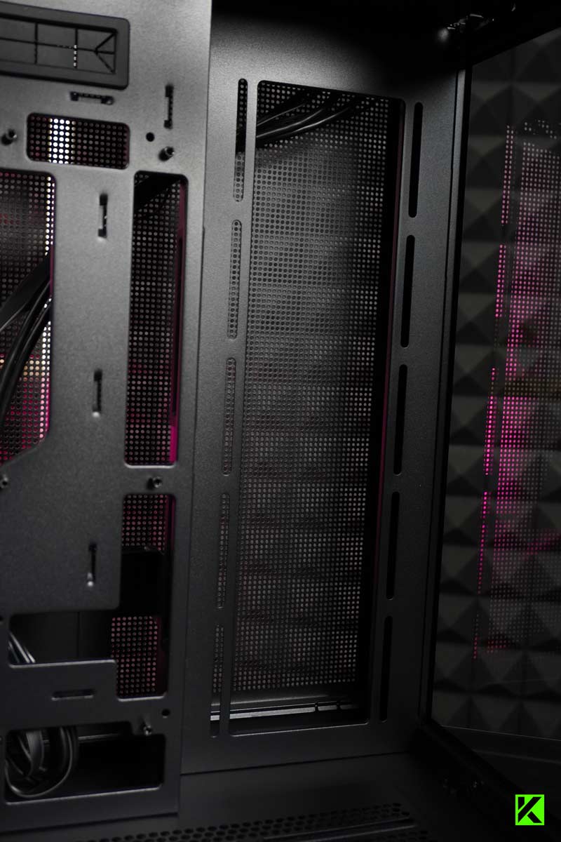 Panel depan terbuat dari mesh plastik yang kokoh dan memungkinkan aliran udara yang optimal untuk menjaga komponen internal tetap dingin.