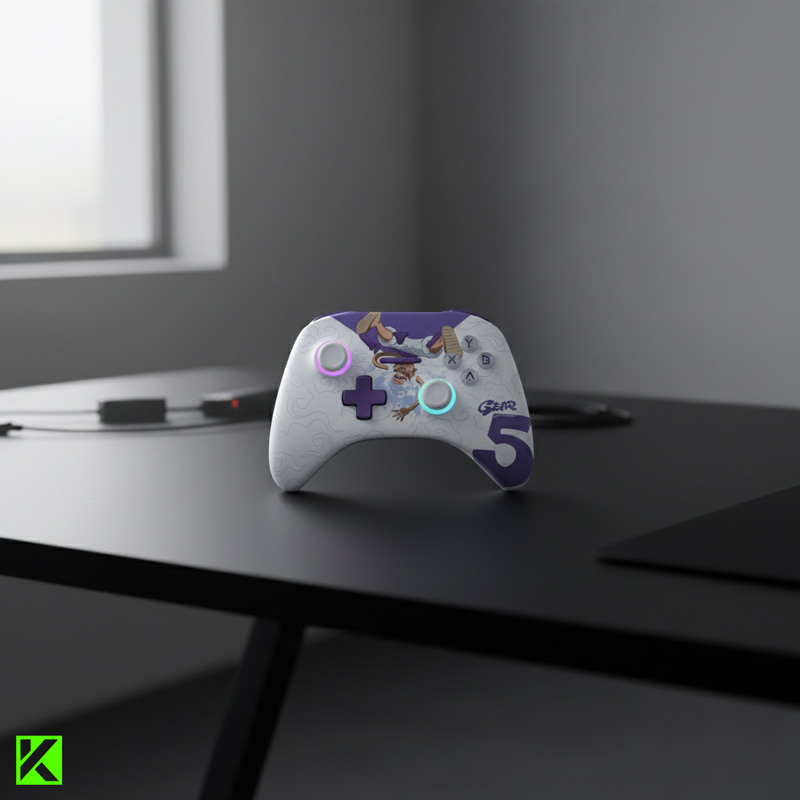 Sekilas pandang, kamu pasti langsung sadar kalau gamepad ini bukan sekadar barang koleksi. Ketika kami pegang pertama kali, tampilannya langsung bikin senyum. Warna putih dominan dengan aksen Luffy versi Gear 5 yang detailnya hidup benar-benar terasa spesial.