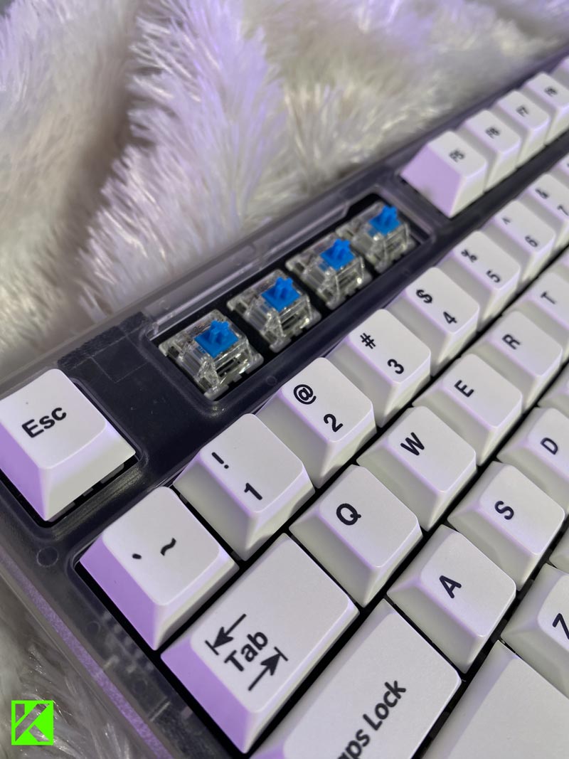 Casing-nya transparan bertipe Retro Frosted ini terbuat dari polikarbonat padat, sehingga saat lampu RGB menyala, keyboard tampak melayang di atas kelap-kelip lampu RGB.