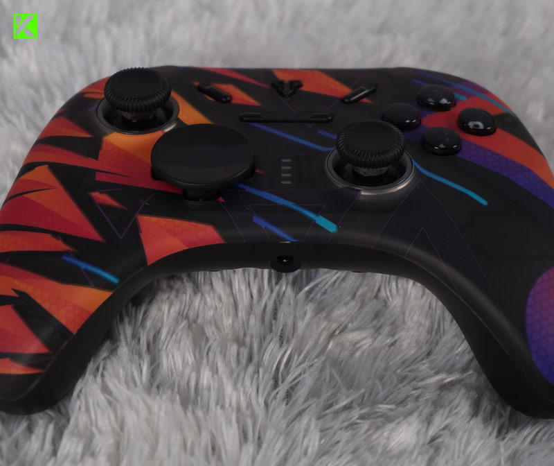 Di bagian tengah gamepad terdapat layout tombol yang familiar, menyerupai controller console pada umumnya. Stick analognya mudah digerakkan dan memiliki sensitivitas tinggi, berkat penggunaan sensor Hall Effect yang anti-drift. Ini tentunya menjadi nilai plus bagi pemain game bergenre FPS atau game fighting yang membutuhkan kontrol presisi.