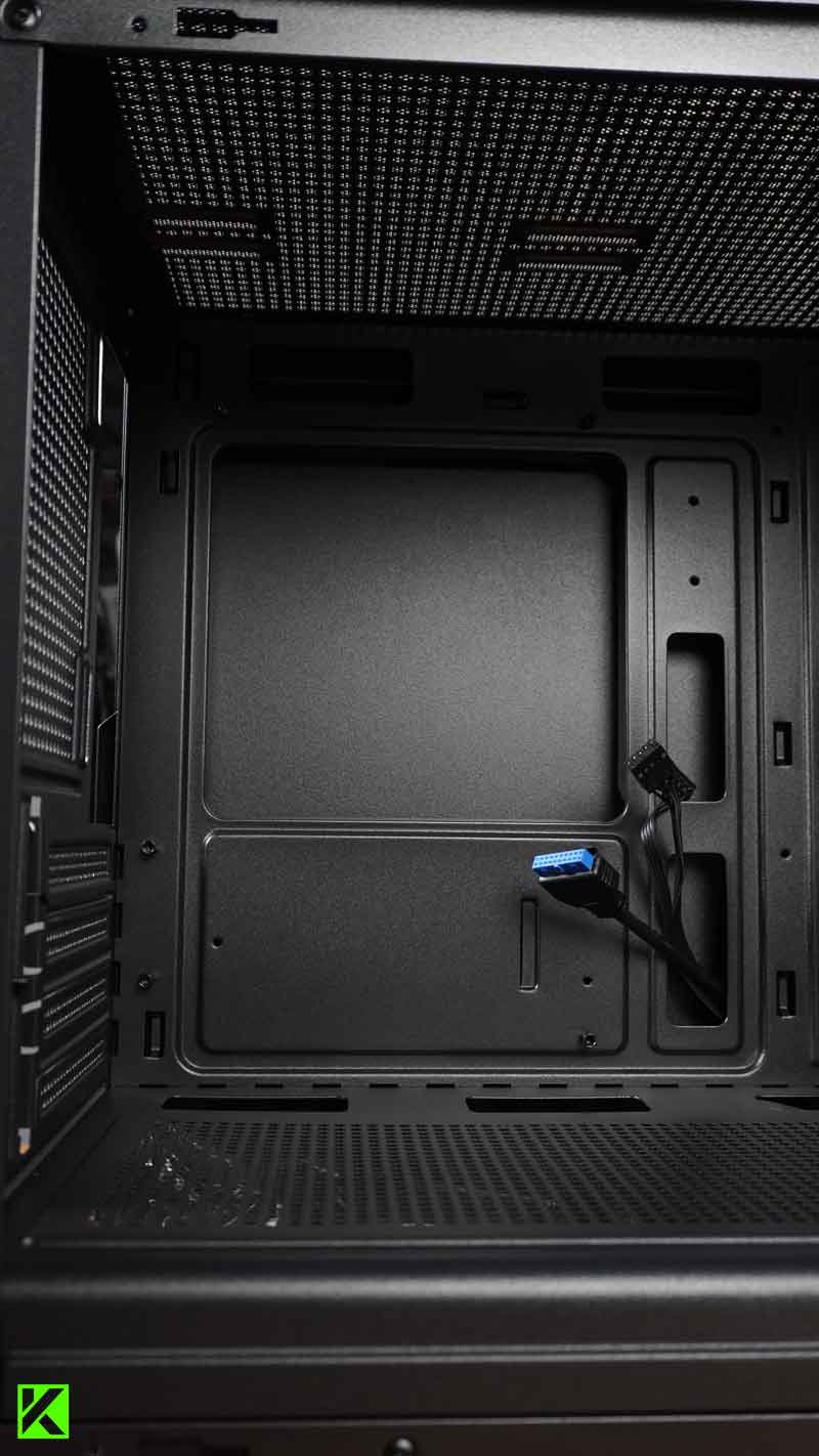 Untuk aspek penyimpanan, casing ini mendukung satu drive 3.5” HDD dan satu drive 2.5” SSD. Dukungan ini cukup untuk menyimpan berbagai data, baik itu game, aplikasi, maupun file-file penting lainnya.