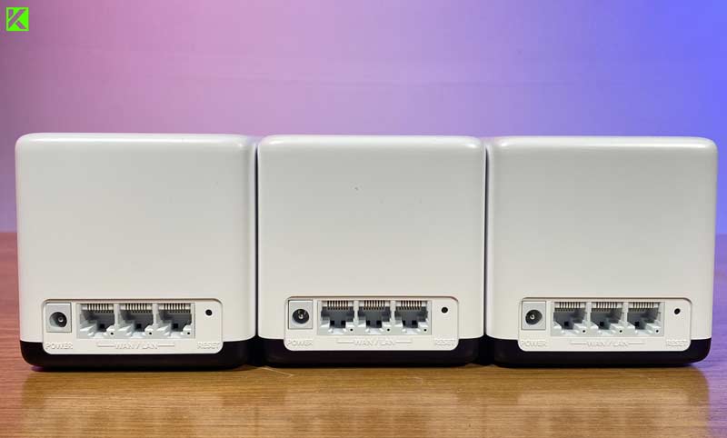 Jika kamu melihat sisi belakang unit mesh, terdapat beberapa opsi konektivitas termasuk 3 Port Gigabit per Unit Halo (penginderaan otomatis WAN/LAN), tombol reset, dan satu port untuk menyambungkan kabel daya.
