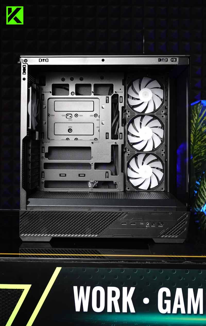 Yang membuat casing ini menarik adalah konsep back-connect motherboard support. Jadi, tidak hanya motherboard biasa yang bisa dipasang, tapi juga motherboard dengan koneksi kabel di belakang, sehingga manajemen kabel jadi jauh lebih rapi.