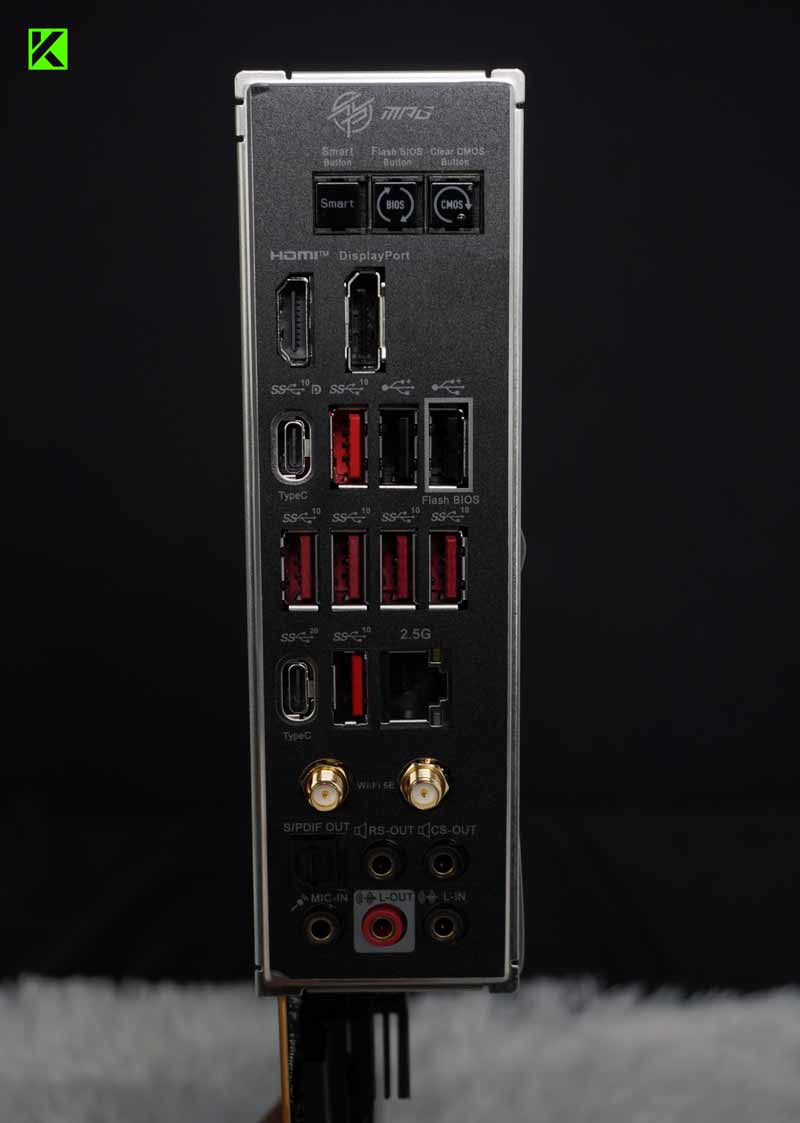 Port I/O panel terletak di bagian belakang motherboard, menyediakan beragam koneksi yang mudah diakses. Selain itu, desain slot RAM yang diberi label dengan warna kontras memudahkan pengguna dalam instalasi dan konfigurasi.