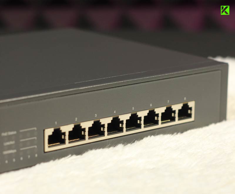 Di bagian depan, kita akan menemukan delapan port Gigabit Ethernet, masing-masing dilengkapi dengan indikator status LED yang memberikan informasi tentang koneksi dan aktivitas port.